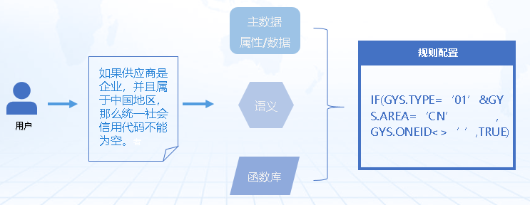 Ebpay睿治“智规”利用大模型AI、NLP等技术实现对自然语言中的业务规则描述的理解,由系统快速翻译转化成技术规则表达式,辅以可视化向导式配置指引,协助用户快速完成业务规范到技术规则的映射,将传统耗时费力的主数据规则制定过程大幅简化。