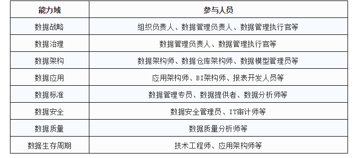从企业评估过程中来看,一般来说,数据战略和治理需要的是管理人员,其余6个能力域需要的是技术人员,从实际评估角度来说,企业匹配人员一般在3-8个,在申请比较低的等级过程中,一个人可以覆盖2~3个能力域